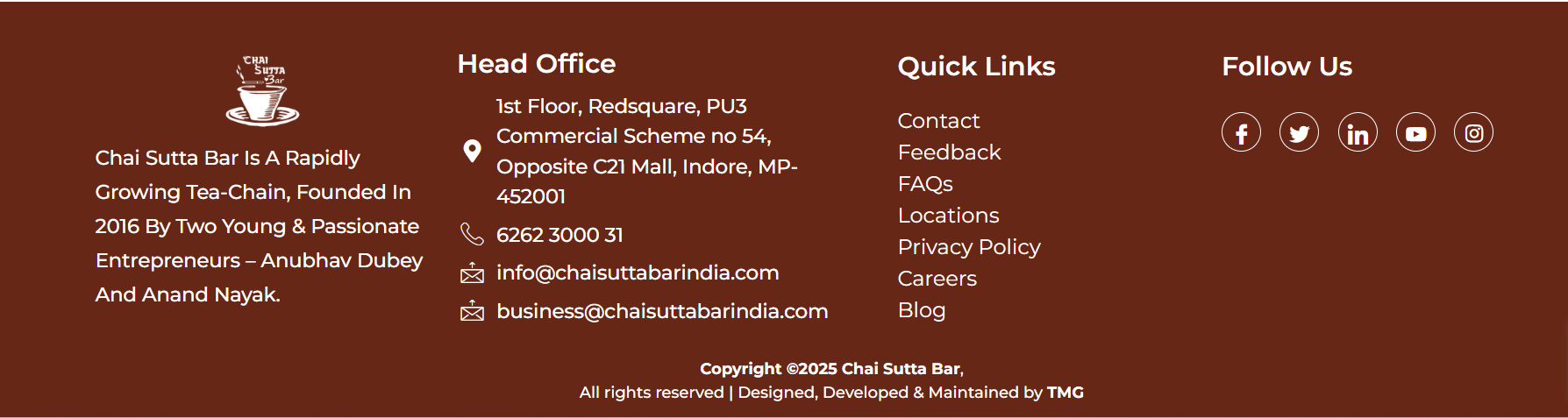 The vision of Chai Sutta Bar(CSB) is to deliver our unique cultural blend and values to each corner of the world. We started 8 years back, and we have accomplished great tasks and achieved incredible milestones. The 600+ franchise outlets, 370+ cities, countless kulhads, and global presence say it all. Without any boundaries, Chai Sutta Bar is now spreading with wings made of people’s love and affection.